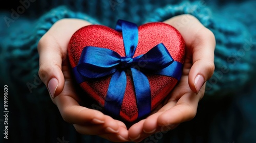 A pair of hands gently cradling a red heart-shaped object adorned with a light blue ribbon,