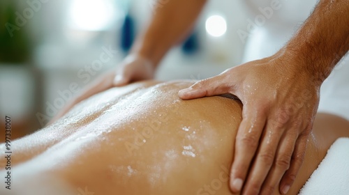 A pair of hands skillfully massaging essential oil into a person’s back, promoting relaxation and wellbeing, in a serene and calming environment, enhancing wellness.