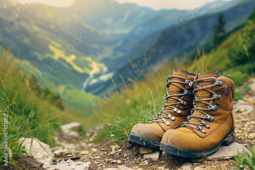 A pair of hiking boots resting on the edge of an outdoor trail.