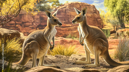A pair of kangaroos interacting in their open zoo enclosure, with the Australian Outback-themed background.