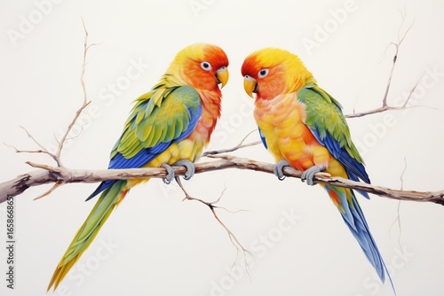 A pair of lovebirds, with their vivid colors and close bond, perched on a branch against a white surface.