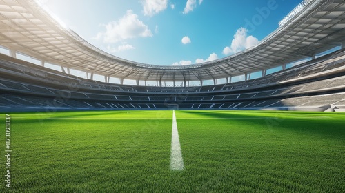 A panoramic view of a modern sports stadium with lush green grass and a clear blue sky, ready for an event.