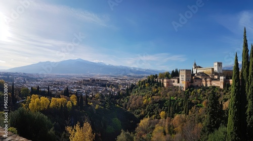 A panoramic view of the Alhambra Palace with the city of Granada and the mountains in the background.
