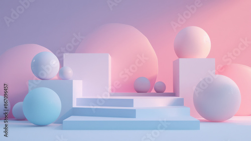 a pastel-colored abstract scene with geometric shapes such as spheres and cubes on a raised platform