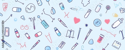 A pattern featuring various medical and scientific icons on a light blue background.