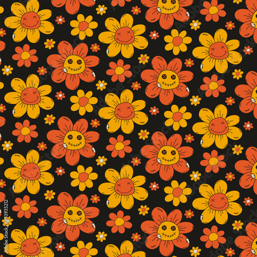 A pattern with bright Halloween colors on a dark background in a flat style