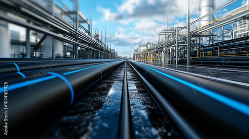 A PE pipe plant filled with coils of high-density polyethylene (HDPE) pipes marked with blue lines, ready for gas and water transport projects, showcasing modern industrial manufac