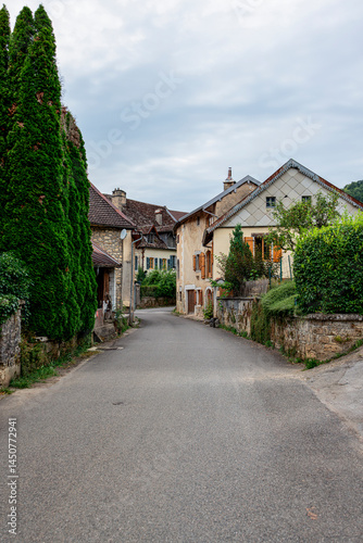 A peaceful and narrow street lined with traditional stone houses in the village of Mouthier-Haute-Pierre, along the Via Francigena in eastern France.