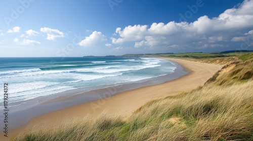 A peaceful coastal view with soft waves and smooth, golden sand, perfect for creating a relaxing ambiance