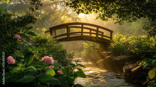 A peaceful garden setting featuring a wooden bridge arching over a gently flowing stream, surrounded by lush greenery and delicate pink flowers.