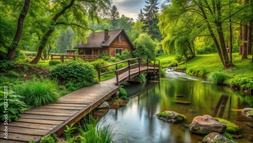 A peaceful house surrounded by lush greenery and a serene stream running gently through the landscape, with a wooden bridge spanning the water in the foreground, serenity, relaxation