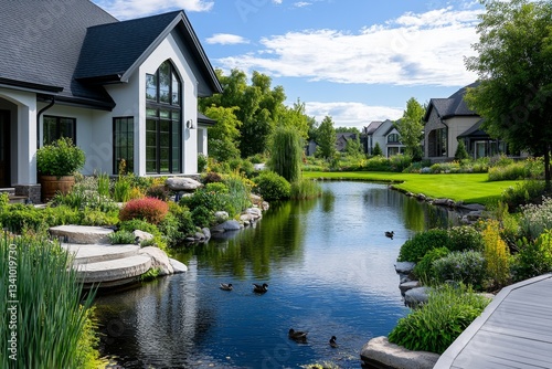 A peaceful lake surrounded by eco-friendly homes in a senior agrihood community, with ducks swimming on the water