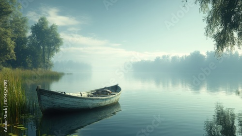A peaceful lakeside with a person fishing from a boat. Featuring calm water and natural surroundings. Emphasizing relaxation and outdoor hobbies. Ideal for nature blogs.