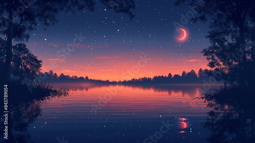 A peaceful, moonlit night scene with a clear starry sky, casting a gentle glow over a calm lake, creating a sense of wonder and tranquility. Clipart illustration style, clean, Minimal,