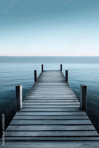 A peaceful wooden dock extends over tranquil waters, evoking calmness and contemplation.