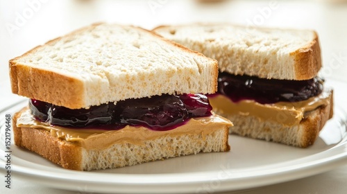 A peanut butter and jelly sandwich with its crust slightly golden and the vibrant fillings slightly oozing out