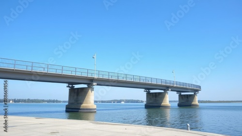 A pedestrian bridge stands out against a clear blue sky with a calm lake in the background, serene landscape, calm lake, reflection on water