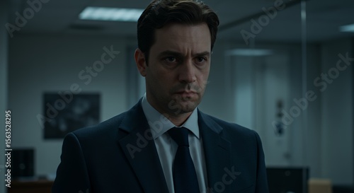 A pensive businessman in a dark suit stares intensely, lost in thought within a dimly lit modern office.