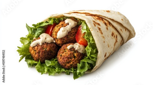 A perfectly assembled falafel wrap with a soft pita, crispy falafel balls, fresh lettuce