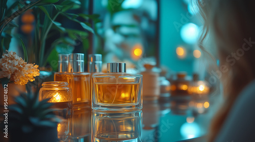 A person applying perfume, with a chic vanity and luxurious bottles in the background.