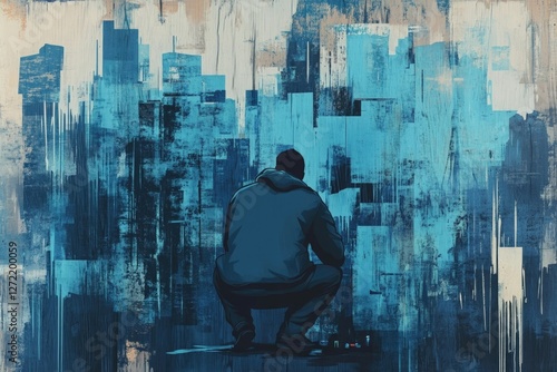 A person crouching before an abstract blue cityscape painting, possibly adding final touches.