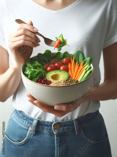 A person holding a bowl filled with a healthy and colorful salad, featuring a variety of greens, vegetables like tomatoes and carrots, avocado, some grains or legumes