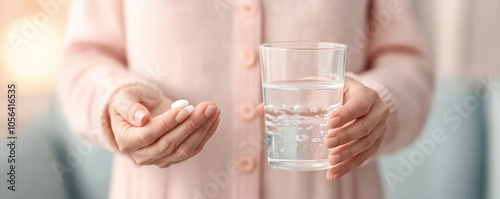 A person holding a pill and a glass of water, symbolizing health, wellness, and medication in a bright, cozy setting.