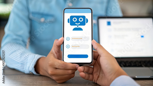 A person holding a smartphone displays a chatbot interface, highlighting user interaction with technology in a modern workspace.