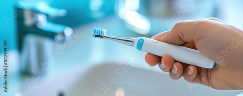 A person holds an electric toothbrush in a well-lit bathroom, emphasizing dental hygiene and modern oral care.