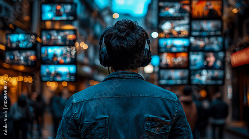 A person in a denim jacket stands in a bustling alley surrounded by numerous screens showing colorful images as the evening sky darkens