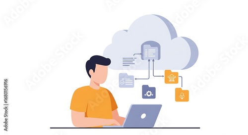 A person interacts with a cloud-based file system using a laptop, showcasing digital data storage and retrieval.