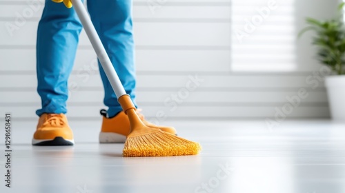 A person is actively sweeping a clean floor with a bright yellow broom, illustrating a moment of cleanliness and the importance of maintaining a tidy living environment.