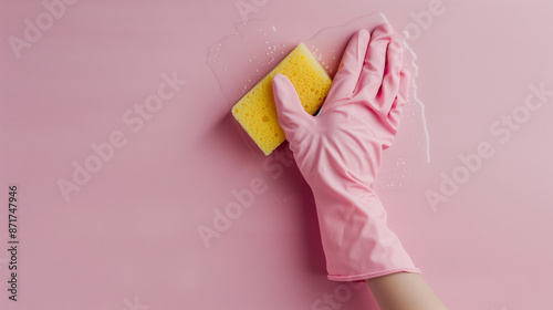 A person is cleaning a yellow wall with a sponge. The sponge is pink and the person is wearing a blue glove