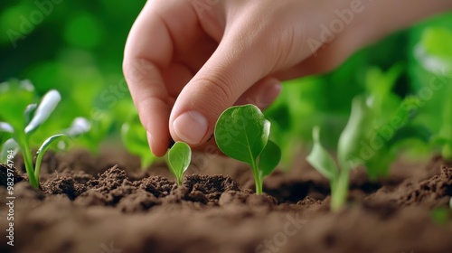 A person is picking a seedling from the ground in dirt, AI