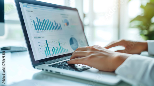 A person is sitting at their desk, typing on the keyboard of an open laptop computer with its screen showing data visualization charts and graphs in a white color theme