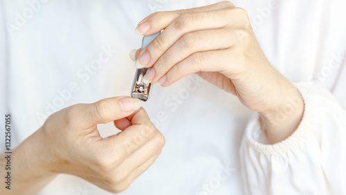 A person is using a nail clipper to trim their nails, showcasing personal grooming in a close-up view.