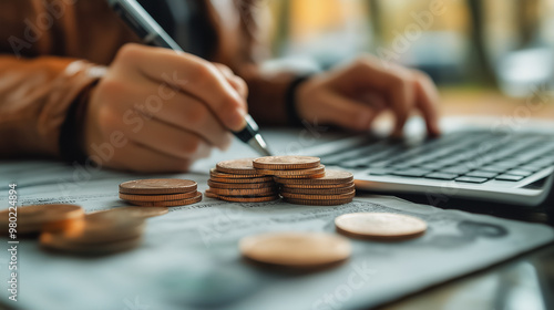 A person is writing on a piece of paper with a pen, and there are several coins on the table. Concept of financial planning or budgeting, as the person is likely writing down their expenses or income