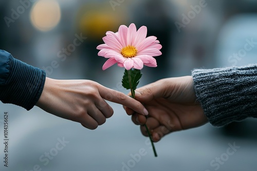 A person practicing random acts of kindness, handing a flower to a stranger, hacking happiness by spreading joy to others