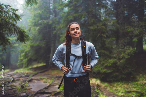 A person running through a misty forest, navigating over tree roots and muddy ground. The scene captures the essence of outdoor adventure and fitness, surrounded by lush greenery and fog.