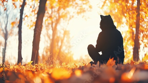 A person sits alone in a park during autumn sunset, surrounded by golden leaves. Concept: solitude, reflection.