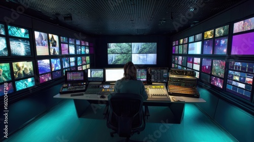 A person sits in a high-tech control room surrounded by multiple screens displaying various video feeds and graphics