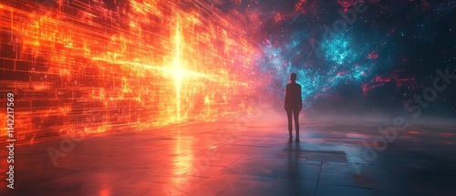 A person standing before a massive symbolic crossroads, reflecting on progress and choices, surrounded by vibrant light beams and futuristic designs, cinematic composition