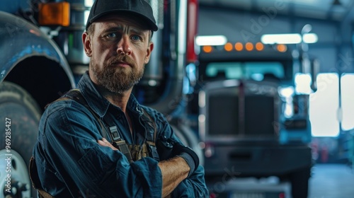 A person standing outside a large truck, possibly waiting or watching