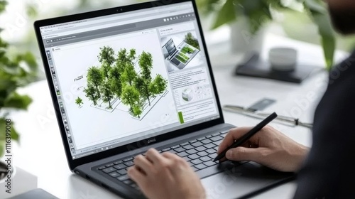 A person using a laptop to design or analyze a landscape with trees.