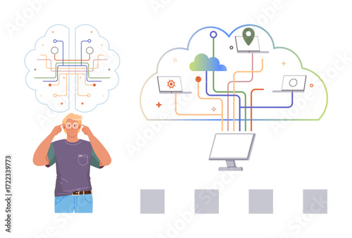 A person visualizing connections between technology tools and cloud computing. Shows cloud, devices, and data arrangement. Ideal for innovation, education, technology, creativity, networking digital