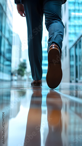 A person walking on a reflective floor in a modern urban environment.