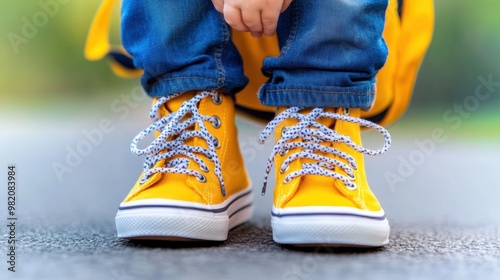 A person wearing yellow sneakers and a backpack with their feet on the ground, AI
