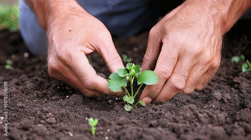 A person's hands carefully planting a small green sprout into the dark soil for a garden.