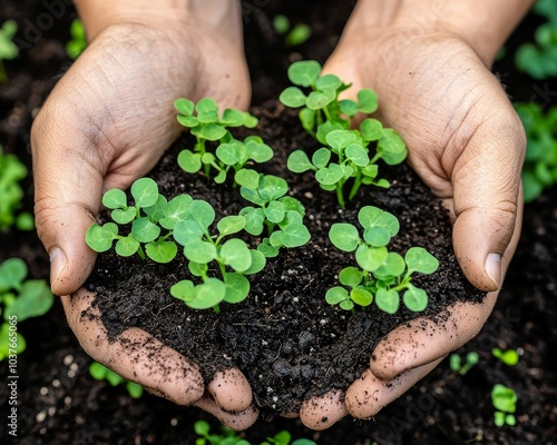A person's hands hold small green seedlings in rich, dark soil, symbolizing growth and nurturing nature.