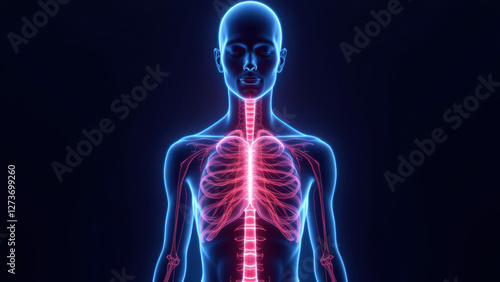 A person's torso with highlighted internal anatomy including skeletal structure and respiratory system, emphasizing VNS (Vagus Nerve Stimulation).